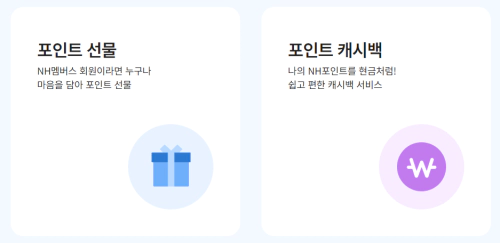 포인트 선물 : NH멤버스 회원 간 포인트 선물이 가능하여 가족이나 친구에게 포인트를 공유할 수 있습니다. 예를 들어, 사용하지 못할 것 같은 포인트를 가족이나 지인에게 선물해 필요할 때 유용하게 쓸 수 있습니다.