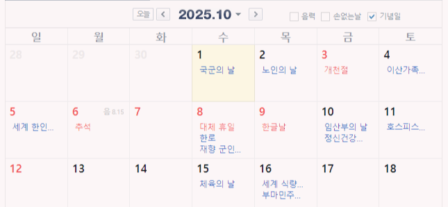 10월 8일 (수) : 추석 연휴 대체휴일 추석 연휴가 끝난 후(10월 5일~7일), 한글날(10월 9일) 사이의 평일인 수요일이 대체휴일로 지정되었습니다. 수요일 하루를 중심으로 연차 하루(10월 10일, 금요일)를 추가로 사용하면 총 6일 이상의 연속 휴식을 즐길 수 있습니다. 명절 피로를 덜고 여행이나 휴식을 계획하기 좋은 시기입니다.